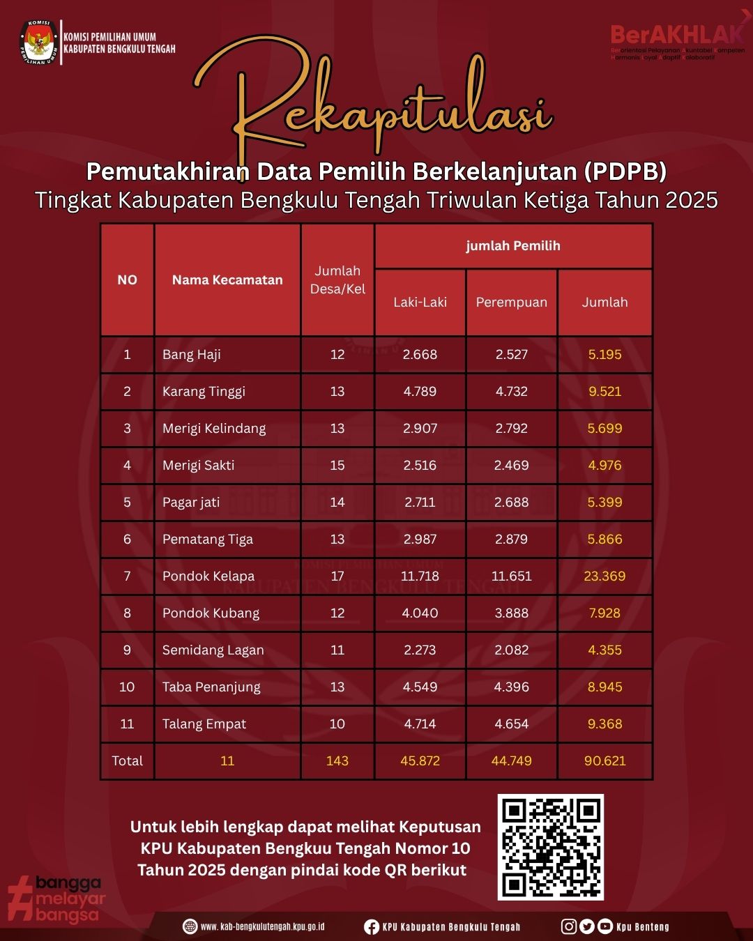 KPU Kabupaten Bengkulu Tengah Menetapkan Hasil Rekapitulasi Pemutakhiran Data Pemilih Berkelanjutan Triwulan Ketiga dengan total pemilih 90.621, 45.872 pemilih laki-laki dan 44.749 pemilih perempuan pada hari kamis, 02 Oktober 2025.