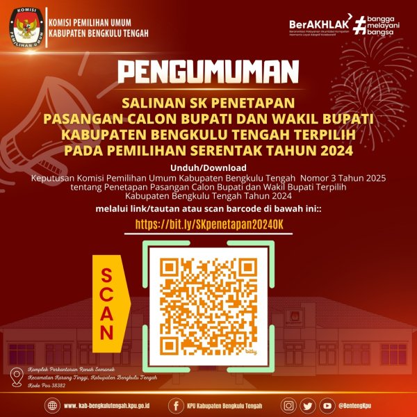 #TemanPemilih, KPU Kabupaten Bengkulu Tengah menerbitkan Keputusan Komisi Pemilihan Umum Kabupaten Bengkulu Tengah Nomor 3 Tahun 2025 tentang Penetapan Pasangan Calon Bupati dan Wakil Bupati Terpilih Kabupaten Bengkulu Tengah Tahun 2024 dalam pelaksanaan Rapat Pleno Terbuka Penetapan Pasangan Calon Bupati dan Wakil Bupati Terpilih Kabupaten Bengkulu Tengah Tahun 2024 yang dilaksanakan di Aula Puncak Tahura Hotel (Desa Tanjung Terdana Kecamatan Pondok Kubang)