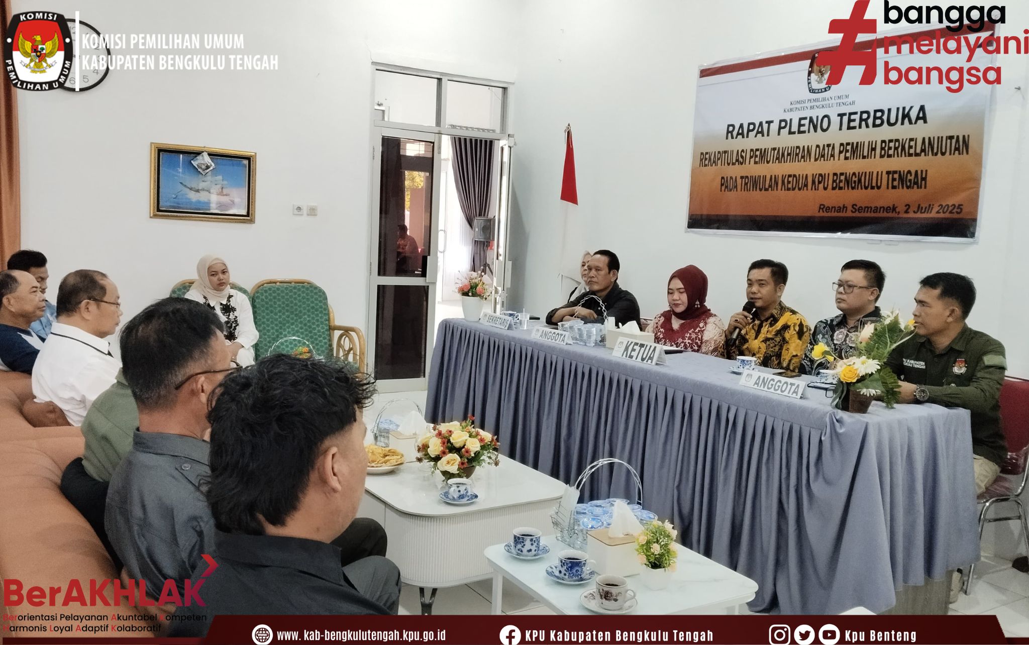 KPU Kabupaten Bengkulu Tengah menggelar Rapat Pleno Terbuka Rekapitulasi Pemutakhiran Data Pemilih Berkelanjutan Triwulan Kedua Kabupaten Bengkulu Tengah pada hari Rabu, 1 Juli 2025. Rapat Pleno Terbuka dihadiri Ketua dan Anggota Kabupaten Bengkulu Tengah dan Stake Holder terkait.