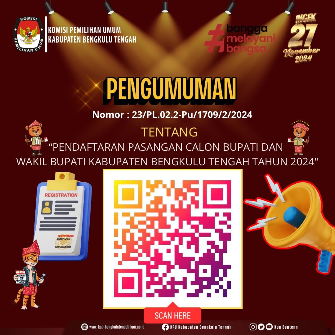 Berdasarkan ketentuan Pasal 137 Peraturan KPU Nomor 8 Tahun 2024 tentang Pencalonan Gubernur dan Wakil Gubernur, Bupati dan Wakil Bupati, serta Walikota dan Wakil Walikota sebagaimana diubah dengan Peraturan KPU Nomor 10 Tahun 2024 tentang Perubahan Peraturan KPU Nomor 8 Tahun 2024 tentang Pencalonan Gubernur dan Wakil Gubernur, Bupati dan Wakil Bupati, serta Walikota dan Wakil Walikota serta menindaklanjuti Surat Dinas Ketua Komisi Pemilihan Umum Nomor 2006/PL.02.2-SD/06/2024 tanggal 9 September 2024 perihal Publikasi Visi, Misi, dan Program Pasangan Calon, KPU Kabupaten Bengkulu Tengah mengumumkan Penerimaan Masukan dan Tanggapan Masayaratak terhadap Pasangan Calon Bupati dan Wakil Bupati pada Pemilihan Bupati dan Wakil Bupati Bengkulu Tengah Tahun 2024 sebagaimana tertuang dalam Pengumuman Nomor 24/PL.02.2-Pu/1709/2/2024.