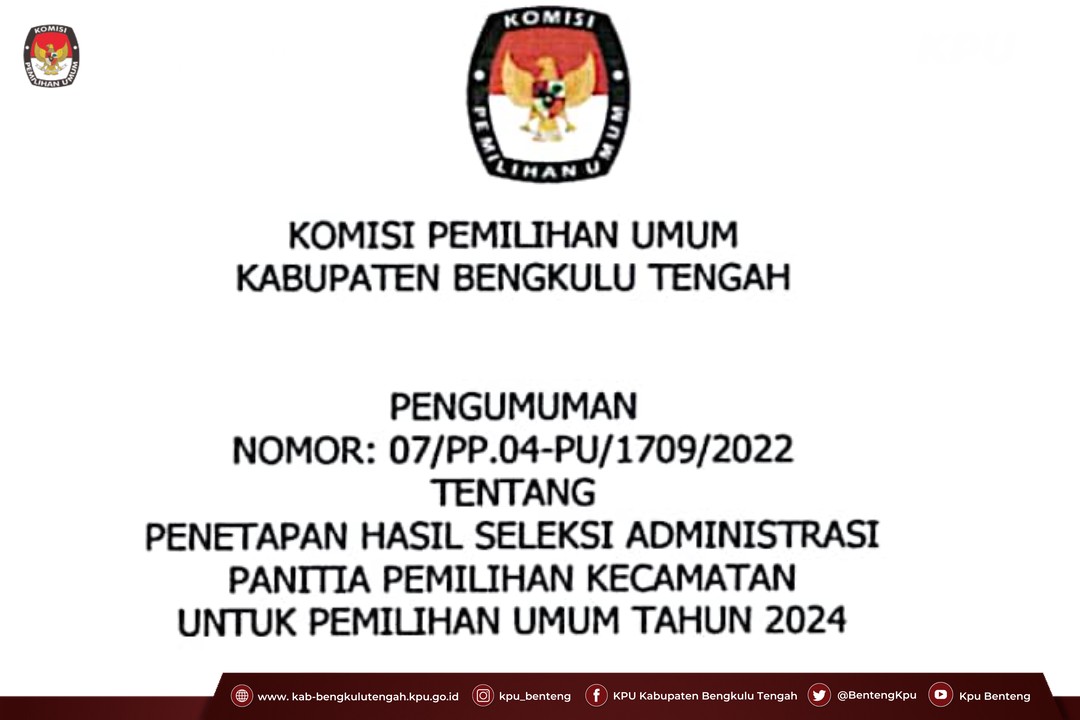 Berdasarkan Berita Acara Komisi Pemilihan Umum Kabupaten Bengkulu Tengah Nomor : 75/PL.01.3-BA/1709/2022 tentang Rancangan Penataan Daerah Pemilihan dan Alokasi Kursi Anggota Dewan Perwakilan Rakyat Daerah Kabupaten Bengkulu Tengah dalam Pemilihan Umum Tahun 2024, dengan ini mengumumkan Rancangan Penataan Daerah Pemilihan dan Alokasi Kursi Anggota Dewan Perwakilan Rakyat Daerah Kabupaten Bengkulu Tengah dalam Pemilihan Umum Tahun 2024 untuk mendapatkan tanggapan dan masukan masyarakat sebagaimana tercantum dalam lampiran pengumuman ini.