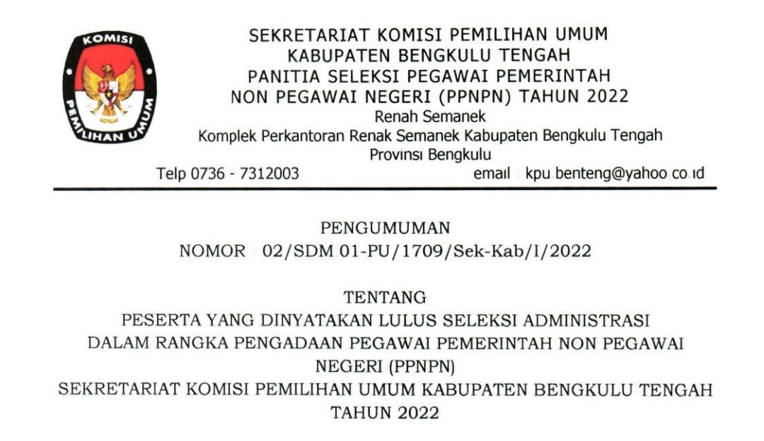 Pengumuman Peserta Lulus Seleksi Administrasi Pegawai Pemerintah Non Pegawai Negeri ( PPNPM) Jumat, 07 Januari 2022 00:00 686 Download file pdf https://kab-bengkulutengah.kpu.go.id/public/kab-begkulutengah2/public/kab-bengkulutengah/dmdocument/1641573638pengumuman ppnpn.pdf Baca Selengkapnya